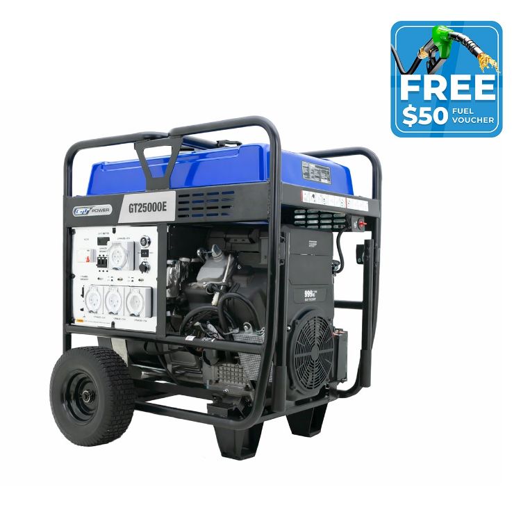 This machine is the Big Boy in the range and packs a serious punch - with a massive 18000W(max) power output and multiple heavy-duty power outlets the GT25000E allows for easy powering of a house, workshop or a work-site. Also, an ideal generator for backup power in natural disasters.